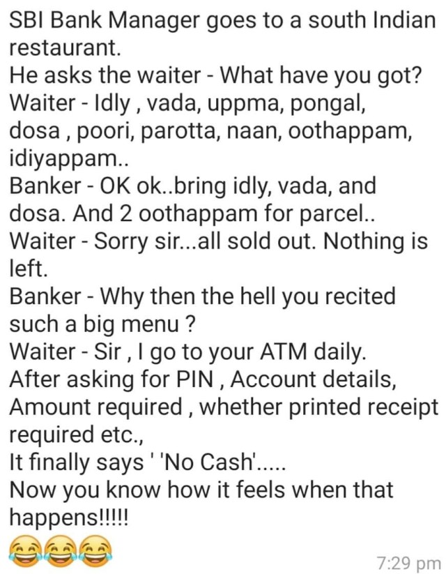 இந்த மாதிரி பிரச்சனையைச் சந்திக்காதவர்களே இருக்க முடியாது. நான் இருந்த ஊர்கள்ல (கல்ஃப்), ஏடிஎம் சில சமயங்களில் வேலை செய்யாமல் அல்லது மெயிண்டெனன்ஸ்ல இருக்கும், அப்போ நாம வங்கிக்குள் சென்று எத்தனை பணம் (குறைந்த அளவுகூட) வாங்கிக்கொள்ளலாம். ஒரு தடவை எனக்கு ஒரு விநோத அனுபவம் ஏற்பட்டது (இங்க எழுதினேனான்னு நினைவில்லை).