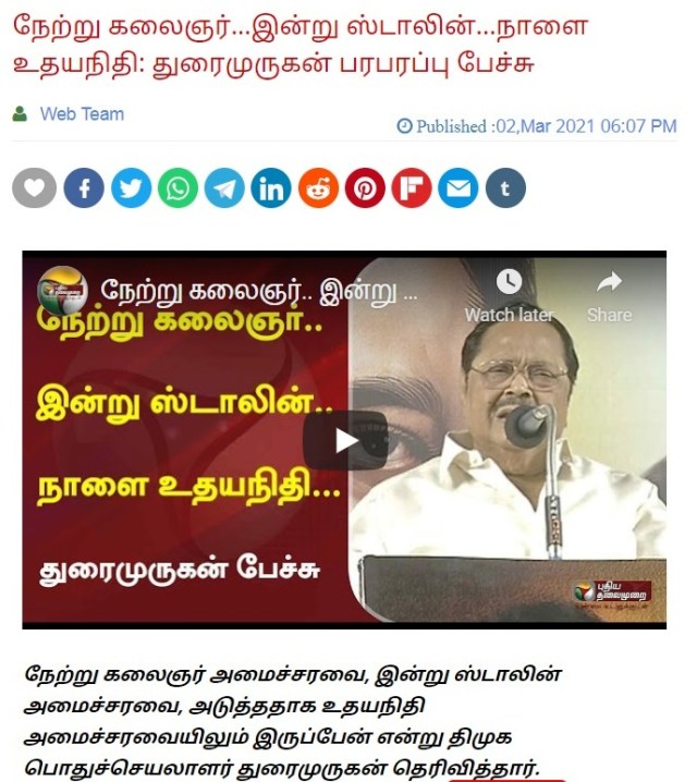 ஒரு மூத்த திமுக பிரமுகர், கடைசிவரை (தன்) மக்களுக்குச் சேவை செய்யணும் என்று ஆர்வத்தோடு இருப்பது தப்பா? ஏற்கனவே, வயசான கிழவர் இன்னும் தொகுதியை இளைஞர்களுக்கு விடாமல் பிடித்துக்கொண்டிருப்பது தவறு என்று துரைமுருகன் தொகுதியைச் சேர்ந்தவர்கள் அதிருப்தி தெரிவிக்கிறார்கள். அதுக்காக (தன்) மக்களுக்குச் சேவை செய்யும் வாய்ப்பை விட்டுக்கொடுக்க முடியுமா இவரால்?