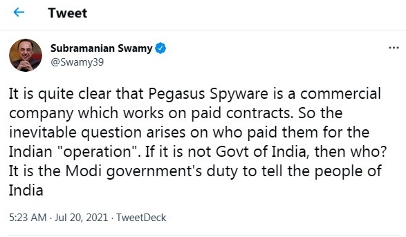 பெகாசஸ் ஸ்பைவேர்-க்கு பணம் கொடுத்தது யார்….?: சு.சுவாமி கேள்வி