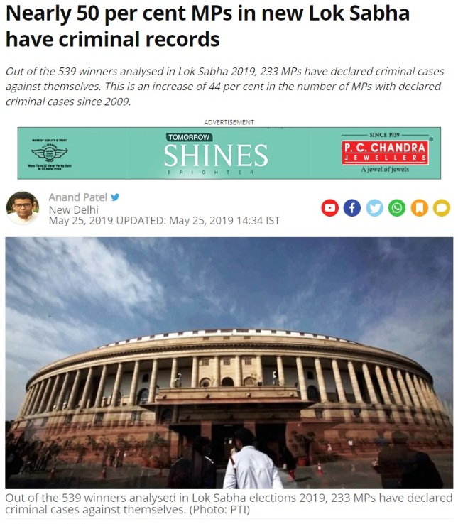 539 உறுப்பினர்களில், 233 பேர் மீது கிரிமினல் வழக்குகள்