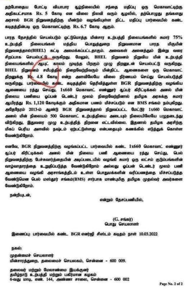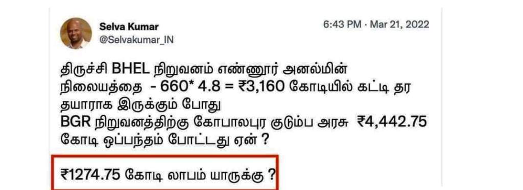 இந்தப் பதிவில் சொல்லியுள்ள தகவல் சரிதானா என்பதில் எனக்குச் சந்தேகம் உண்டு. நஷ்டத்தினால் ஷேர் 60 உள்ள ஒரு நிறுவனத்துக்கு பெரிய ஆர்டர் கொடுத்ததன்மூலம் ஷேர் 90 ஆகி, அதனால் எத்தனை கோடிகளோ லாபம் அடைவதற்காக இந்த அட்டு BGR நிறுவனத்திற்கு ஆர்டர் கொடுத்திருக்கிறார்கள் என்றும் படித்தேன். இவையெல்லாம் காழ்ப்புணர்ச்சியில் சொல்லப்படுவது. முதல்வர், தன் குடும்பத்தோடு தனி விமானத்தில் துபாய் சென்று தமிழகத்துக்கு முதலீடுகளை ஈர்க்கவேண்டு என்ற நோக்கத்தோடு தன் பேரன் பேத்தி சூழ நல்ல எண்ணத்தில் சென்றதையே சிலர், அங்கு ஆரம்பிக்கப்போகும் ஐயாயிரம் கோடி முதலீடுக்காக (Palm Beach hotel resort) செல்கிறார் என்றும் அது கேடி உறவுகள், பேரன் பேத்திகளின் பெயரில் என்றும் சில இடங்களில் படித்தேன். இதெல்லாம் காழ்ப்புணர்வு என்றே எனக்குத் தோன்றுகிறது. விமர்சனம் செய்பவர்கள் ‘உள்ளூரில் ஓணான் பிடிக்க முடியாதவர் உளுந்தூர்பேட்டையில் ஒட்டகம் பிடிக்கப் போவதைப் போல’, அரசின் செலவினங்களுக்கு அரசு நிறுவனங்களான ஆவின், தமிழக கூட்டுறவுச் சங்கங்கள், பெல் போன்றவற்றிர்க்கு ஆர்டர் கொடுத்து செலவை மிச்சப்படுத்தி, செலவழியும் பணமும் அரசுக்கே வரும்படியாக வருவதைச் செய்யாமல், மற்ற நிறுவனங்களுக்குக் கொடுத்து ஆயிரம் கோடிகளுக்கு மேல் கமிஷன் அடிக்கிறது திமுக அரசு என்று சொல்வதும் ஏற்புடையதா என்று யோசிக்கிறேன்.
