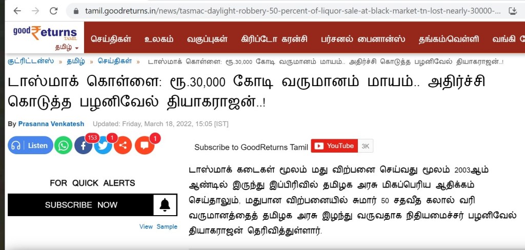 டாஸ்மாக் 30,000 கோடி வருமான இழப்பு