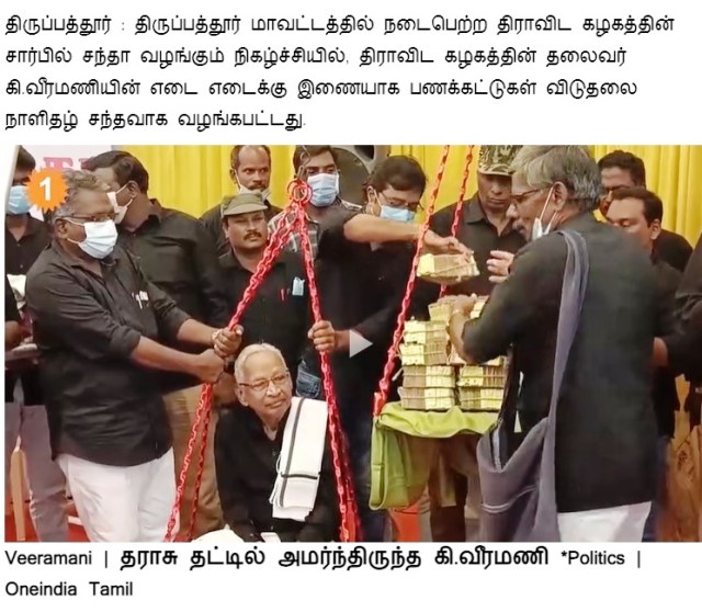 திருப்பத்தூர் மாவட்டத்தில் நடைபெற்ற திராவிட கழகத்தின் சார்பில் சந்தா வழங்கும் நிகழ்ச்சியில், திராவிட கழகத்தின் தலைவர் கி.வீரமணியின் எடை எடைக்கு இணையாக பணக்கட்டுகள் விடுதலை நாளிதழ் சந்தவாக வழங்கபட்டது.