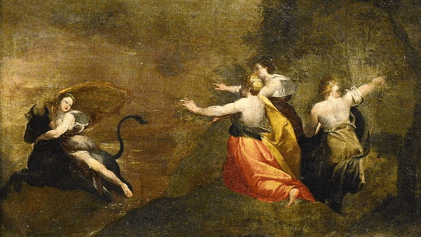 ஐரோப்பியக் கண்டத்தின் தாயாகக் கருதப்படும் யுரோபா, காளை வடிவிலிருந்த காதலன் ஜீயஸின் முதுகில் ஏறி பயணிக்கும்