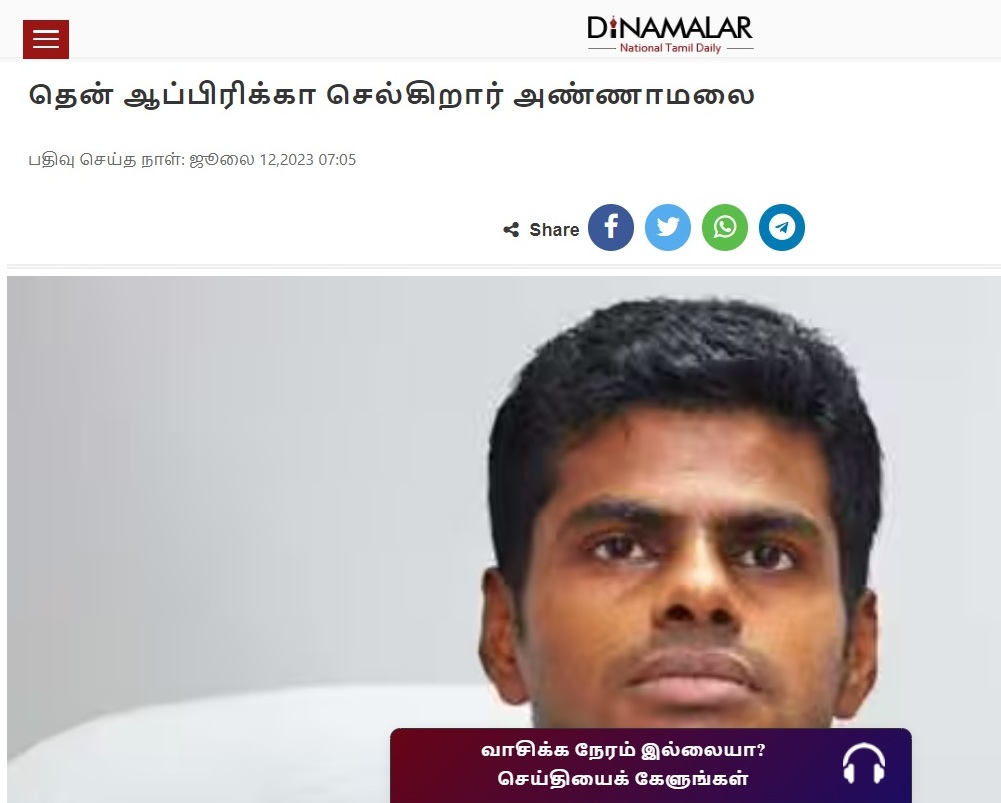 தென் ஆப்பிரிக்கா செல்கிறார் அண்ணாமலை – தினமலர் …!!!