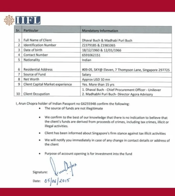 இந்த கணக்கில் செய்யப்பட்ட முதலீட்டுக்கான ஆதாரமாக அவர்கள் சம்பளம் பெற்ற பணத்தை முதலீடு செய்வதாக குறிப்பிட்டு உள்ளனர். மேலும் புச் தம்பதியின் நிகர சொத்து மதிப்பு 10 மில்லியன் டாலர்கள் என்றும் IIFL-ல் ஒரு முக்கிய அதிகாரி கையெழுத்திட்டு உறுதி செய்துள்ளதாக அந்த ஆவணத்தில் கூறப்பட்டுள்ளது. IPE Plus Fund 1 என்ற பல அடுக்குகள் கொண்ட பண்ட் நெட்வொர்க்-ஐ நிர்வாகம் செய்வது IIFL அமைப்பு தான்.
