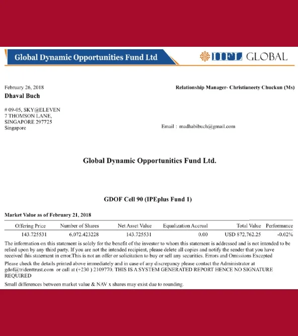 இதற்கு பின்னர், 2018 பிப்ரவரி 26-ஆம் தேதி வெளியிடப்பட்ட கணக்கு விபத்தில், மாதபி புச்சின் பர்சனல் மெயில் ஐடி-க்கு அனுப்பப்பட்ட கடிதத்தில், இந்த கட்டமைப்பின் முழு விவரங்களும் வெளிப்படுத்தப்பட்டுள்ளன. அதில், “GDOF செல் 90 (IPE Plus Fund 1)” என்றும் குறிப்பிடப்பட்டுள்ளது. அந்த நேரத்தில் புச் தம்பதியின் இந்த பண்டில் இருக்கும் பங்கின் மதிப்பு 872,762.25 டாலர்கள் என தெரிவிக்கப்பட்டுள்ளது.