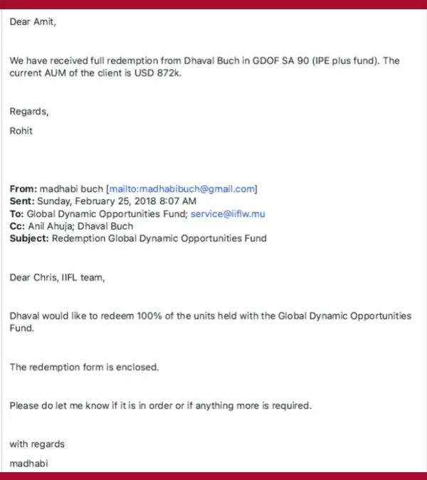 பின்னர், 2018 பிப்ரவரி 25-ஆம் தேதி, மாதபி புச் செபி-யின் முழுநேர உறுப்பினராக இருந்தபோது, தனது கணவரின் பெயரில் வணிகம் செய்து, தனது தனிப்பட்ட ஜிமெயில் மூலம் இந்திய இன்ஃபோலைன் நிறுவனத்திற்குக் கடிதம் எழுதியுள்ளார். அதில், “GDOF செல் 90 (IPE Plus Fund 1)” பண்டில் உள்ள பங்குகளை விற்பனை செய்யும்படி கோரியுள்ளார்.