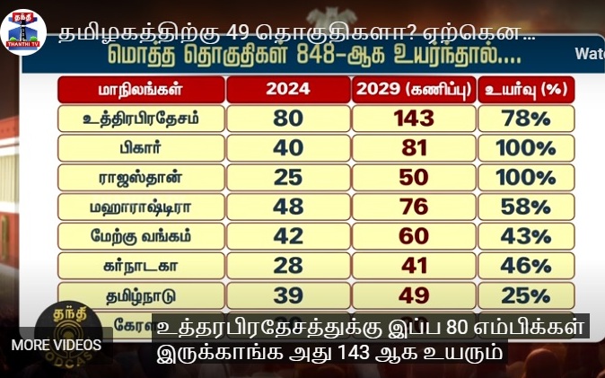 தொகுதி சீரமைப்பு செய்து மக்கள் தொகைக்கு ஏற்றபடி பாராளுமன்ற உறுப்பினர்கள். தமிழகத்துல 8 கோடி, உபில 80 கோடி மக்கள்னா, தமிழகத்துக்கு 10 எம்பின்னா உபிக்கு 100 எம்பி. இதுல என்ன தவறு இருக்கு? அந்தமாதிரி கணக்குலதானே இட ஒதுக்கீடு கொள்கை திமுக சொல்லுது. ஜாதி சதவிகிதத்துக்கு ஏற்றபடி இட ஒதுக்கீடு. ஆனால் மத்திய அரசு ஒரு காம்ப்ரமைசுக்காக தமிழகத்துக்கு இடங்களை அதிகரித்து 45 எம்பிக்கள் ஆக்கி உபிக்கும் 80ல இருந்து 120ஆ ஆக்கிவிடும்னு நினைக்கிறேன்