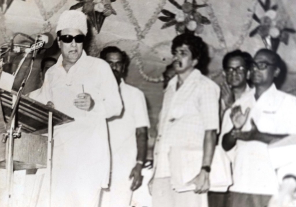 ( எனக்கு கிடைத்த அதிருஷ்டமான வாய்ப்பு – எம்.ஜி.ஆர். அவர்களுடன் -அவருக்கு அருகே நான் ( Master of Ceremony -யாக – HAPP , திருச்சி – பாதுகாப்புத் துறை தொழிற்சாலைக்கு அடிக்கல் நாட்டும் விழாவில் – 24/03/1984 )