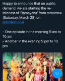 … … … நேற்று நாம் இந்த வலைத்தளத்தில் பேசிக்கொண்டிருந்தது – ( “ராமாயண்” – ராமரும் சீதையும் இப்போது எப்படி இருக்கிறார்கள்…??? ) – தூர்தர்ஷன் காதுகளில் எட்டி விட்டது போலிருக்கிறது…!!! 🙂 🙂 🙂 நாளை முதல் ராமானந்த் சாகரின் பழைய “ராமாயண்” தொடரை மீண்டும் தூர்தர்ஷன் நேஷனல் தொலைக்காட்சியில் ஒளிபரப்ப தீர்மானித்திருக்கிறார்கள். … Continue reading