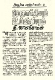 ………………………………………. …………………………………………. ‘ஐயா…ஐயா ‘பதில் இல்லை உள்ளேயிருந்து… ‘சுவாமி ‘ சுவாமி ‘பதில் இல்லை.‘வெற்றிலைக்காரம்மா ‘ வெத்தலைக்காரன் வந்திருக்கேன்….யாரு உள்ள ‘ ‘‘யாரு ? ‘‘நான் தாம்மா வெத்திலெ ‘ வேதாந்தி இடை வழியைப் பார்க்கிறார். நடை வழியில் சுவரை ஒட்டி ஒரு திண்ணை. அந்த திண்ணையின் மேல் உட்கார்ந்திருந்த கிழமுகம் தெரிகிறது. பொல்லென்று வெளுத்த … Continue reading